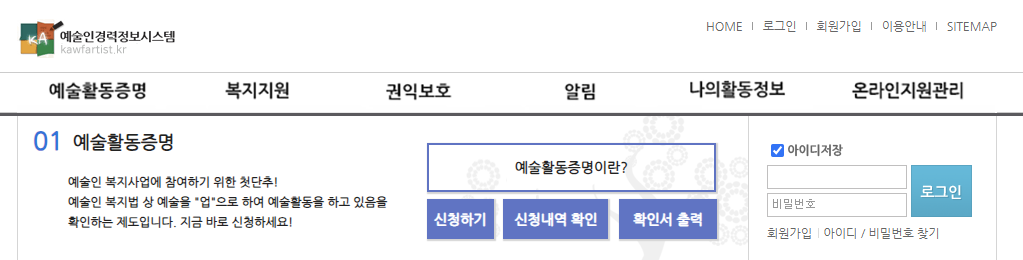 예술인경력증명 홈페이지 1. 신진예술인 예술활동준비금 지원 사업