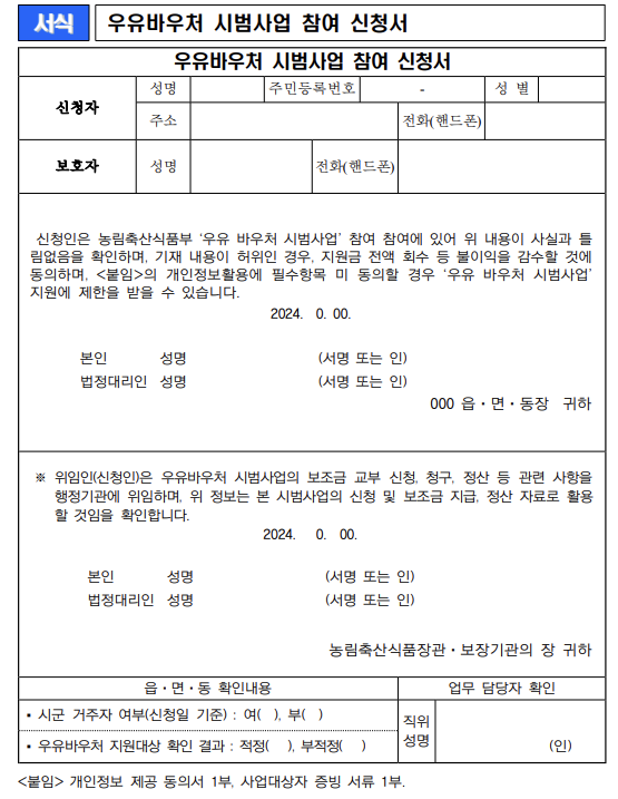 실제로 행정복지센터 방문 후 우유바우처 사업 신청에 대한 안내를 받으면, 아래와 같은 양식을 작성하게 됩니다.
