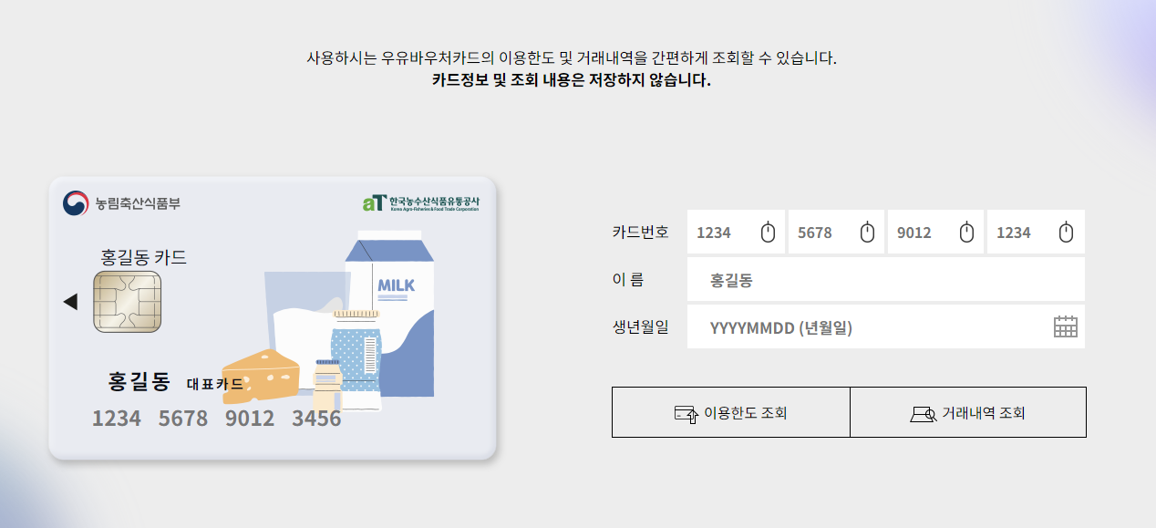 마지막으로 발급받으신 우유바우처 카드의 잔액 조회 또한 아래의 사이트에서 확인하실 수 있습니다.