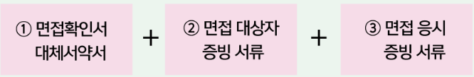 - 대상자 증빙 서류 (면접 참석안내, 서류 합격 안내문 등) + 면접 응시 증빙 서류 (면접 결과, 기업 담당자 명함, 면접장에서 촬영한 사진, 기업 담당자와 나눈 문자 내용 등 )